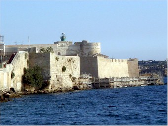 Notizie storico-critiche. L’indizio più remoto del castello risale al novembre del 1239, in una lettera di Federico II indirizzata a Raccordo da Lentini. Subì alcuni danni dopo il terremoto del 1693 ed in seguito allo scoppio di esplosivi il 5 novembre del 1704. Questi causarono il crollo delle volte e del torrione N-O e lo squarcio dei muraglioni. La solidità e la compostezza conferitagli dalla pianta quadrangolare e le quattro torri cilindriche poste agli angoli sono caratteristiche appartenenti alla consolidata tradizione locale. Tuttavia, di netta estrazione stilistica cistercense sono le volte a crociera costolonate, la simmetria degli spazi interni, la pulizia scultorea dei conci perfettamente squadrati, la raffinatezza degli elementi decorativi. Descrizione dell’impianto. Il castello, primo fra tutti ad essere costruito, prese il nome dal capitano bizantino Giorgio Maniace, e la struttura rimane fondamentalmente simile all’originale. L’importanza architettonica degli interni lascia intendere la funzionalità e l’uso residenziali dell’edificio. Non mancano tratti ornamentali e soluzioni arredative la cui unica spiegazione è da ricercare nei gusti estrosi dell’imperatore. La pianta è quadrangolare (41x41m) con una superficie di 2601 mq. Ai quattro angoli si ergono altrettante torri. Di queste la più integra è quella sistemata nell’angolo O, di cui è ancora agibile la scala. Poco resta dell’antica struttura di campate coperte da volte a crociera. Nella parte S-E, nei magazzini, si osservano ancora alcune delle originarie volte costolonate, sostenute da belle colonne e da capitelli decorati. L’interno a scacchiera dell’unica grande sala è formato da 25 campate con arcate ogivali coperte da volte a crociera costolonata. La presenza di pilastri circolari e semicircolari conferiscono ulteriore slancio al sistema architettonico. Un terrazzo costituiva la coperta del castello. Vi si accedeva tramite scale a chiocciola scavate all’interno delle torri, precedute piccoli ambienti rettangolari coperti da volte a crociera. Nessun indizio di piani superiori. All’esterno la trifora gotica della facciata S-O, interrompe il disegno regolare delle finestre più piccole poste su di un piano superiore.