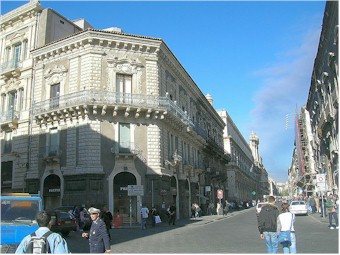 via dei Crociferi e via Etnea a Catania. Lunga circa duecento metri, via dei Crociferi è stata costruita nel XVIII secolo e presenta, in una unità compositiva, tutti edifici in stile barocco siciliano. Essa parte da Piazza San Francesco d'Assisi. Passando sotto l'arco di San Benedetto che unisce la Badia maggiore alla Badia minore si accede alla strada ricca di edifici pubblici. Sono, infatti, presenti ben quattro chiese, monasteri e pochi edifici privati. Si inizia con la Chiesa di San Benedetto congiunta al convento delle suore. Essa possiede una bellissima scalinata ed è racchiusa da una cancellata in ferro battuto. Poi ecco la Chiesa di San Francesco Borgia seguita dal Collegio dei Gesuiti (che ospita oggi l'Istituto d'arte), al cui interno si apre un prezioso chiostro con portici ad arcate. Posta davanti il Collegio, si offre la bellezza della Chiesa di San Giuliano. Progettata da Giovan Battista Vaccarini in perfetto stile Barocco siciliano, ha una facciata elegantemente convessa dalle linee semplici, propria di questo stile. Andando oltre via Antonio di Sangiuliano, si presenta ai nostri occhi il Convento dei Crociferi e la Chiesa di San Camillo. Al termine della via è posta Villa Cerami, attualmente utilizzata dalla facoltà di giurisprudenza dell'Università di Catania. Via Etnea, lunga circa tre chilometri, attraversa da nord a sud la città. Prospetticamente è posta verso l’Etna, leggermente ruotata, per la presenza nel tessuto urbano delle rovine dell’anfiteatro romano. Essa va dalla Piazza del Duomo al Tondo Gioeni. Partendo dal Duomo si arriva, percorrendola, poco dopo a piazza Università, dove si ergono, naturalmente, il palazzo dell'Università e il palazzo Sangiuliano, ambedue in stile barocco, edificati nella prima metà del Settecento. Essa presenta quattro candelabri bronzei del famoso scultore Mimì Maria Lazzaro, ispirati da tre antiche leggende catanesi (Colapesce, i Fratelli Pii e Gammazita), più una quarta, la storia di Uzeta, d’invenzione artistica. Proseguendo e passando davanti la Basilica Collegiata, si giunge ai Quattro Canti catanesi, formati dall’incrocio tra via Etnea e via Antonino di Sangiuliano. Oltre la successiva Chiesa dei Minoriti, si arriva a piazza Stesicoro (Porta Jaci), ove si trovano il monumento a Vincenzo Bellini e i resti dell'anfiteatro romano, posto a circa 10 m sotto la quota della strada. Continuando la passeggiata, arriviamo a Villa Bellini, il maggiore parco compreso nel centro storico. Essa è collegata al Lungomare dall’ampia via Umberto, dove è posto l’ingresso monumentale della Villa stessa. Oltrepassando l'incrocio con il viale Regina Margherita, ecco la piazza Cavour (il Borgo), dove è stato posto il monumento della dea Cerere, originariamente collocato a piazza Università. L’ultimo tratto di via Etnea, prima di giungere al Tondo Gioeni, presenta una pendenza maggiore e un’epoca di costruzione più recente, il XX secolo. Su esso si affacciano il giardino botanico, l’Ospizio dei Ciechi e l’Istituto Zooprofilattico. Via Etnea termina con il Parco Gioeni. |