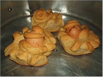 con forme diverse, che ingloba delle uova sode (cuddura cull'ova),