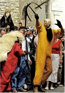 mascherate, due diavoli, vestiti di rosso, e la Morte, vestita di
