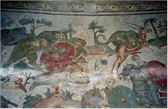Descrizione dell’impianto: L’impianto della villa si articola su tre grandi assi principali: il nucleo principale con il peristilio, la basilica e gli appartamenti di abitazione; il peristilio ovoidale con l’aula trichora; le terme. I diversi orientamenti sono dovuti a preesistenze di una villa del I secolo d. C., ma soprattutto ad esigenze funzionali legate al corso del sole ed alla direzione dei venti. Il propylon a tre fornici è preceduto da un grande cortile (10), si entra quindi in un cortile poligonale chiuso su tre lati da un portico ionico (2) con una fontana al centro. Da qui si poteva passare verso le terme, o, tramite un vestibulum (ingresso) (18), verso il nucleo centrale della villa. Il vestibulum decorato con un emblema, immette nel grande peristilio rettangolare (19), con un portico costituito da colonne corinzie. Al centro del peristilio si trova una grande fontana mistilinea con un bacino centrale e due bacini minori semicircolari alle sue estremità. Sul lato ovest del quadriportico è inglobato un piccolo sacello absidato (a), forse un larario. Sullo stesso lato si apre un cortile triangolare (20) che conduce ad una latrina privata (2). Tutto il lato nord del peristilio è occupato da una serie di ambienti (22 – 29) disposti in doppia fila nella quale si deve identificare un appartamento di carattere privato destinato agli ospiti ed al personale di servizio. Sono chiaramente riconoscibili una cucina (24), e quattro cubicola (26 - 29), decorati con la caratteristica decorazione musiva di soggetto erotico. La sala più grande (30) di questo settore ha il pavimento ornato dal famoso mosaico della “Piccola Caccia”, si tratta probabilmente di una cenatio invernale. Seguono due stanze di servizio (31, 32) con mosaici geometrici. Sul lato est del peristilio si trova un lungo corridoio (ambulacrum) (36) “il Corridoio della grande caccia” che misura oltre 65 m e che si trova in posizione rialzata rispetto al peristilio da cui è accessibile tramite tre scalinate: due laterali in corrispondenza dei rami nord e sud del portico, ed una centrale in corrispondenza dell’ingresso della basilica. Il corridoio, decorato da splendidi mosaici pavimentali, è concluso da due absidi alle sue estremità. L’ambulacrum fungeva da elemento di raccordo ed, insieme, di separazione tra la parte privata della villa e quella ufficiale di rappresentanza.