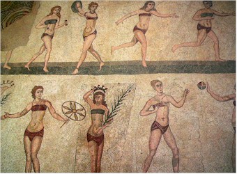 Le stanze 32 e 33 sono ornate con mosaici geometrici. Notevole è il mosaico che orna il lungo corridoio (36) che ha il suo centro in corrispondenza dell’ingresso alla basilica (58). La decorazione dell’ambulacro (36) è nota col nome di mosaico della “Grande Caccia”, che rappresenta la cattura di fiere destinate ai giochi dell’anfiteatro. Il mosaico riproduce realisticamente il paesaggio delle varie regioni in cui avveniva la cattura, mentre nelle due absidi del corridoio le raffigurazioni delle regioni sono allegoriche. Nell’abside di sinistra è probabilmente rappresentata la Mauretania (Marocco): una figura femminile fiancheggiata da due belve. Nell’abside destra è rappresentata l’India: una figura di donna seminuda seduta, con una zanna di elefante nella mano sinistra, tra una tigre ed un elefante. Sopra quest’ultimo è rappresentata la fenice, il mitico uccello che si voleva originario dell’Arabia o dell’India. A partire dalle due absidi, in direzione del centro, si snodano scene che rappresentano la caccia alle belve: scene di caccia di pantera in Mauretania; scene di caccia all’antilope, al leone, al cinghiale ambientate in varie zone dell’Africa settentrionale. Nel quadro successivo è raffigurato un ambiente in parte civilizzato (ville) e in parte selvaggio, in cui si svolge il trasporto di animali catturati che giungono in un porto (Cartagine). Il tratto di mosaico successivo, posto di fronte alla basilica, rappresenta il porto di arrivo, da identificare col porto di Roma. Questo è il nucleo di tutta la composizione. Dalla passerella della nave vengono sbarcati una fiera in una cassa ed uno struzzo. Al di sopra si trova raffigurato un elefante (resti), seguito da due funzionari in abito militare col tipico berretto pannonico, a forma cilindrica. Sull’altro lato viene sbarcata una tigre. Questa scena costituisce a sua volta la conclusione della parte sud del mosaico che ha inizio dall’estremità opposta. Dopo la rappresentazione allegorica dell’India segue la scena della cattura del grifone, il mitico uccello originario dell’Oriente, attirato dentro una gabbia per mezzo di un’esca umana. Segue una particolare scena di caccia alla tigre. I cuccioli della tigre vengono rapiti da un uomo a cavallo che si dirige verso una barca che lo attende. In alto sono rappresentati animali selvatici. Si ritiene che tutte queste scene siano ambientate in India. In basso segue il trasporto degli animali; in alto altre scene di caccia di cui una all’orso. Sotto quest’ultima è rappresentato un gruppo di persone tra cui si distingue un personaggio anziano, barbuto, riccamente vestito, con berretto pannonico e bastone a fungo. Alcuni studiosi hanno identificato questo personaggio con il proprietario della villa.