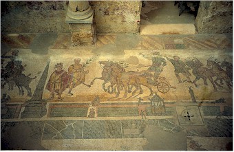 Nella stanza 45 sono rappresentate gare musicali e teatrali di bambini. Al centro di questa stanza, nel posto probabilmente occupato dal letto, ritroviamo la rappresentazione di un ramo d’edera. Si ipotizza che questa fosse la stanza da letto del proprietario della villa. Sulla soglia davanti all’abside è rappresentato un tavolo con due corone e due sacchi di monete, come nella stanza 42 nell’abside troviamo donne che intrecciano corone. La stanza 33 presenta un pavimento a mosaico geometrico. Nell’ambiente 34 si trova invece il famoso mosaico delle fanciulle “in bikini”, impegnate in gare di atletica. In un angolo è visibile il mosaico geometrico preesistente. La sala successiva 35 è molto simile per la forma, le misure e la decorazione alla stanza 41. il mosaico pavimentale rappresenta Orfeo che, con la lira, ammansisce le fiere. In alto a sinistra sono rappresentati animali fantastici come il grifone e la fenice. Il pavimento del portico ovoidale 46 rappresenta girali di acanto con busti di animali selvatici. Gli ambienti 47, 48, 49, sono decorati con scene di vendemmia. Gli ambienti 50, 51e 52 sono invece decorati con scene di pesca. I mosaici della sala trichora (57), che era quella dei banchetti ufficiali, rappresentano al centro gli avversari mostruosi sconfitti da Ercole: il leone nemeo, l’idra di Lerna, etc.etc. Nell’ abside di sinistra (a nord) è rappresentata l’apoteosi di Ercole assunto nell’Olimpo ed incoronato da Giove. La predella antistante rappresenta due scene di metamorfosi: quelle di Dafne in alloro e quella di Ciparisso in cipresso. Nell’abside destra (a sud) è rappresentato il mito della nascita della vite con Licurgo ed Ambrosia. La predella antistante è perduta. Nell’abside in fondo (a est) è rappresentato il mito dei Giganti uccisi da Ercole. Nella predella sono raffigurate altre due metamorfosi: quella di Andromeda e quella di Endimione in astri. Le terme: il mosaico pavimentale di quello che è stato identificato come l’apodyterium (21; spogliatoio) rappresenta la padrona di casacon i due figli e tre ancelle. Due ancelle portano una cassetta con dei vestiti e la terza gli unguenti.