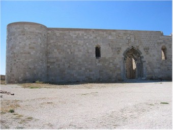 Decorazioni esterne ed interne. All’esterno, nella fiancata N-O del perimetro esterno vi è il portale ad arco ogivale, contraddistinto da una forte policromia derivante dall’utilizzo di calcare siracusano e pietra lavica, e dalla presenza di forti elementi decorativi: foglioline uncinate nel sottarco, elementi scultorei zoomorfi ormai illeggibili nell’archivolto, capitelli delle colonnine negli sguanci. Ai lati del portale vi sono due mensole dove in origine erano due arieti in bronzo. Uno è scomparso, l’altro è custodito al museo archeologico di Palermo. Al di sopra dell’arco vi è lo stemma spagnolo del 1614. Negli interni ritroviamo caratteristiche che appartengono agli edifici monastici cistercensi. Bisogna subito notare la presenza del granito in sostituzione della più comune pietra calcarea e la raffinata foggia dei capitelli a conferire ulteriore eleganza e bellezza all’ambiente. Grande cura e perfezionismo traspaiono dall’esame degli intagli dei costoloni, dai banconi attorno al perimetro, dalle porticine all’estremità delle fiancate. All’interno delle torri alcune stanze portano decorazioni con figure di leoni. In una di esse sopravvive la figura di un giovane dalle lunghe chiome ed il capo sormontato da una corona. Nell’ angolo O tracce di uno dei quattro grandi camini, anch’esso fiancheggiato da mensole che dovettero sostenere antiche sculture. Piccole panche di pietra sporgono lungo le pareti. Presso al torre posta ad O si trova una porta che dà accesso ad una scala. Essa conduce ai sotterranei..