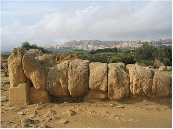 Descrizione dell’impianto. Il tempio sorgeva su un basamento rettangolare colossale su cui si ergeva un crepidoma di 5 gradini. In origine il tempio era costituito da un naos pseudo-periptero (ovvero una cella circondata da una fila di colonne) e da un grande muro, formato da semicolonne, che ne sostituiva il peristilio . Le semicolonne, sette nei lati corti e quattordici nei lati lunghi, fornite di uno zoccolo che continuava negli intercolumni, invece dei normali tamburi erano composte di piccoli conci tagliati a cuneo e disposti a ventaglio. Negli intercolumni, a sorreggere l'enorme peso della trabeazione, erano posti a mezza altezza i grossi telamoni. L'epistilio era formato da tre strati di conci sia nel senso dello spessore che nell'altezza ed era coronato da tenia con tegole a sei gocce. La cella interna presentava la normale pianta tripartita: naos-pronao e epistodomo, i muri perimetrali dei lati lunghi non erano continui, ma intervallati da una serie di dodici piloni quadrangolari. Della trabeazione dorica si conservano soltanto piccoli frammenti; nelle rovine del crollo sono state rinvenuti elementi del fregio a metope, triglifi e delle geison . Poco avanti il frontone orientale del Tempio sono i resti della sua grande Ara.
